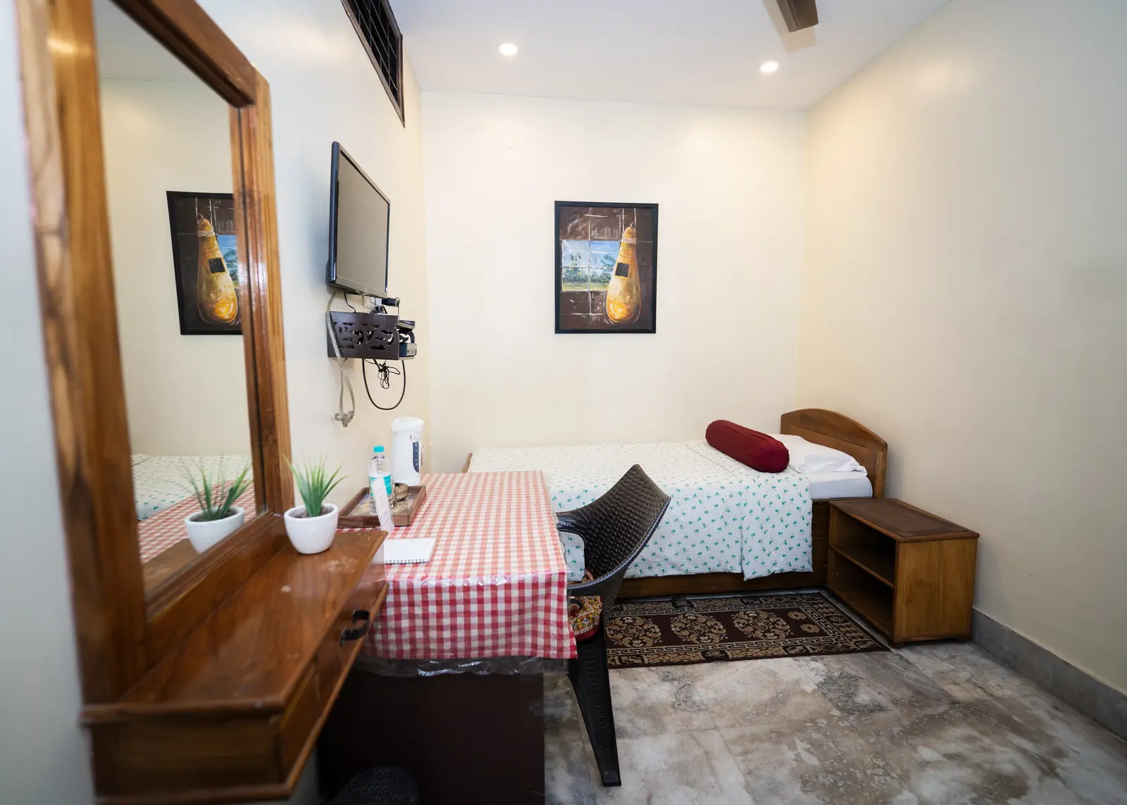 Our Single Deluxe room, designed specifically for solo guests, provides a cozy and peaceful setting for rest and rejuvenation. This room, which has a single bed, a writing desk, and tasteful furnishings, is surrounded by a simple yet charming environment. The room encourages you to enjoy the peace away from the hustle and bustle of the city